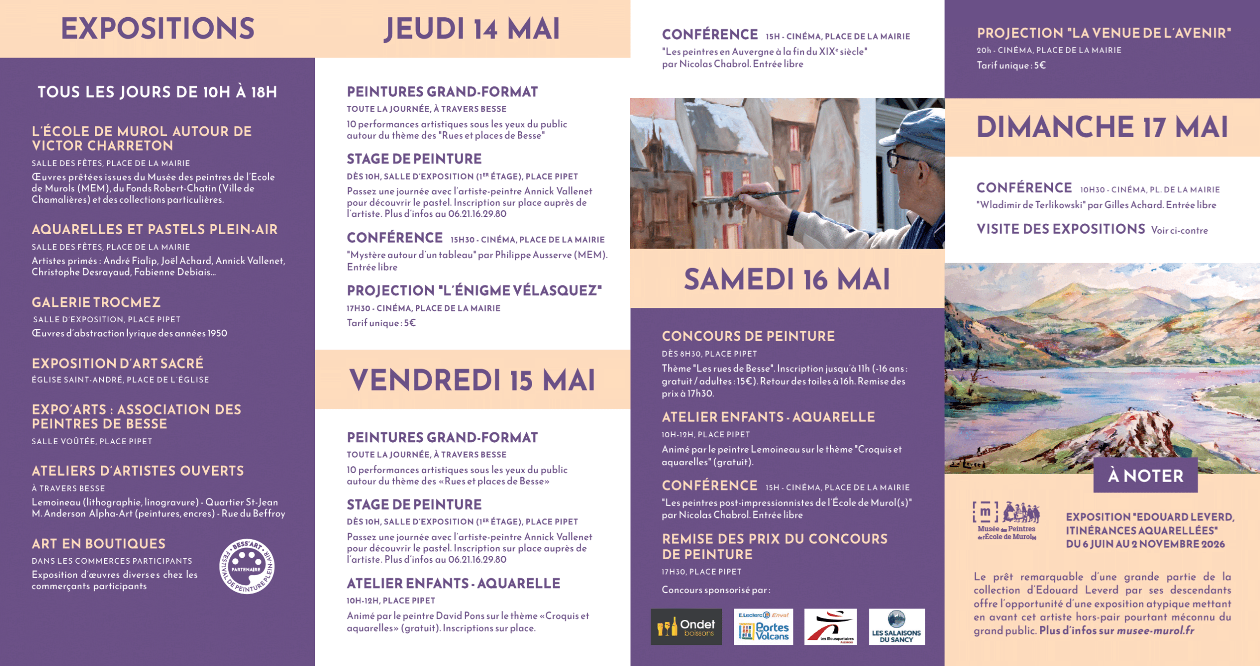 - 15/05 à 15h : “Les peintres en Auvergne à la fin du XIXe siècle” et le 16/05 à 15h : “Les peintres post-impressionnistes de l’École de Murol(s)”. Deux conférences conduites par Nicolas Chabrol (Historien de l’Art), spécialiste dont les recherches ont révélé l’École de Murol(s) ;