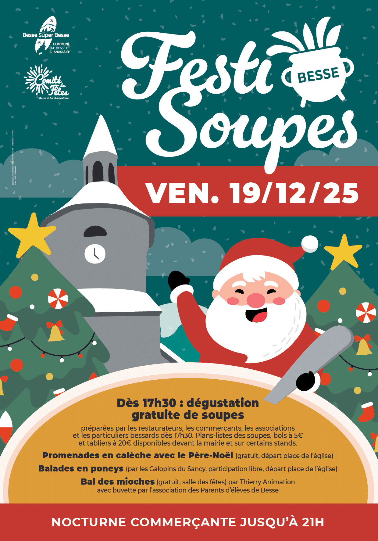 Vendredi 19/12 dès 17h30, RDV pour la 4e édition de Festi'Soupes. Au menu : dégustation gratuite de soupes dans le centre de Besse, calèche du Père-Noël, Baluche des Mioches... (programme à venir).