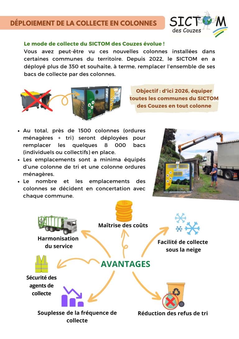 Il faut souligner que la qualité du tri est essentielle tant du point de vue écologique que du point de vue économique. En effet, les irrégularités de tri induisent des pénalités financières à l’encontre du SICTOM des Couzes, répercutées in fine à l’usager. Le déploiement des colonnes et leur bonne utilisation se traduira par une baisse de la Taxe d’enlèvement des ordures ménagères.